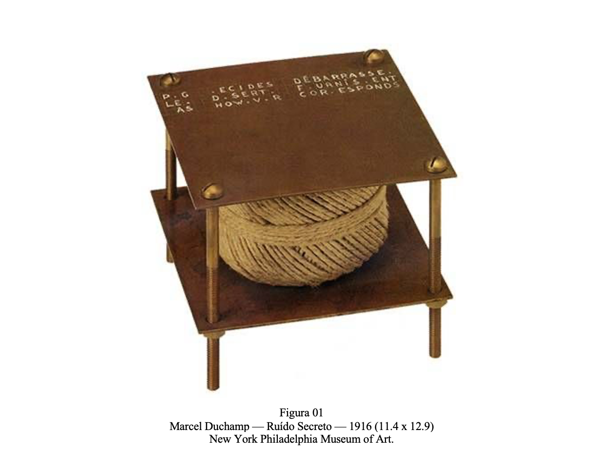 No ângulo mais elevado da sombra do objeto (sobre a superfície de uma mesa-objeto, por exemplo) é tecido um páramo onde o olhar descansa — e o que é requerer, senão sinalizar sua presença? O olhar o sabe. Este objeto plausível – que demanda para nós algum sentido – ao menos se enunciado, advém da sua abstração necessária à corelação com o seu objeto posto entre, sobre, abaixo ou ao largo de uma superfície; quando posto, demanda sempre alguma enunciação (e a palavra objeto e seu “estar num lugar” requerem um objeto para além do seu útil). O “espírito do objeto” é uma projeção, e pode existir em nós pelas afetividades, muito mais através da “nódoa da vidraça da janela”, aquela da memória individual; o espírito e o espaço interior, de habitar constituem – entre si e para os que aí habitam – alternâncias de ângulos agudos e obtusos, salientes e reentrantes. O objeto é plausível na medida em que é assentado nas mãos, no horizonte do olhar sobre um lugar-superfície. Assim, as possibilidades geométricas do objeto não se esgotam. O objeto é um elemento “vivo” — não no sentido latino de anima -, mas de determinação, mais ou menos independente de uma demanda de significação a partir da sua posição de ociosidade. Sobre a determinação do objeto em ociosidade, em “Ruído Secreto” (1916), o cordão tece uma “pausa” no interstício quadrado e de metal, entre as paralelas, num apelo cujo discurso secreto convém apenas entender aos iniciados no ócio contemplativo. O tipo de ociosidade que se vê aí, na obra de Duchamp (Figura 01)[2]é imposto pela composição e pela voz média do rolo de barbante amarrado a si mesmo. No centro obscuro do rolo há um hiato onde o ruído — segundo a ordem de permanência da obra em importância e significado — repercute em segredo. Talvez não se possa auscultar esta aflição orgânica, de sons monossilábicos, visto que não poderia haver nisto, até aqui, enquanto uma demanda racional para a linguagem. Todavia, a sua posição possibilita um transito de linguagens. Mas o que é um ruído no horizonte ocioso do objeto?