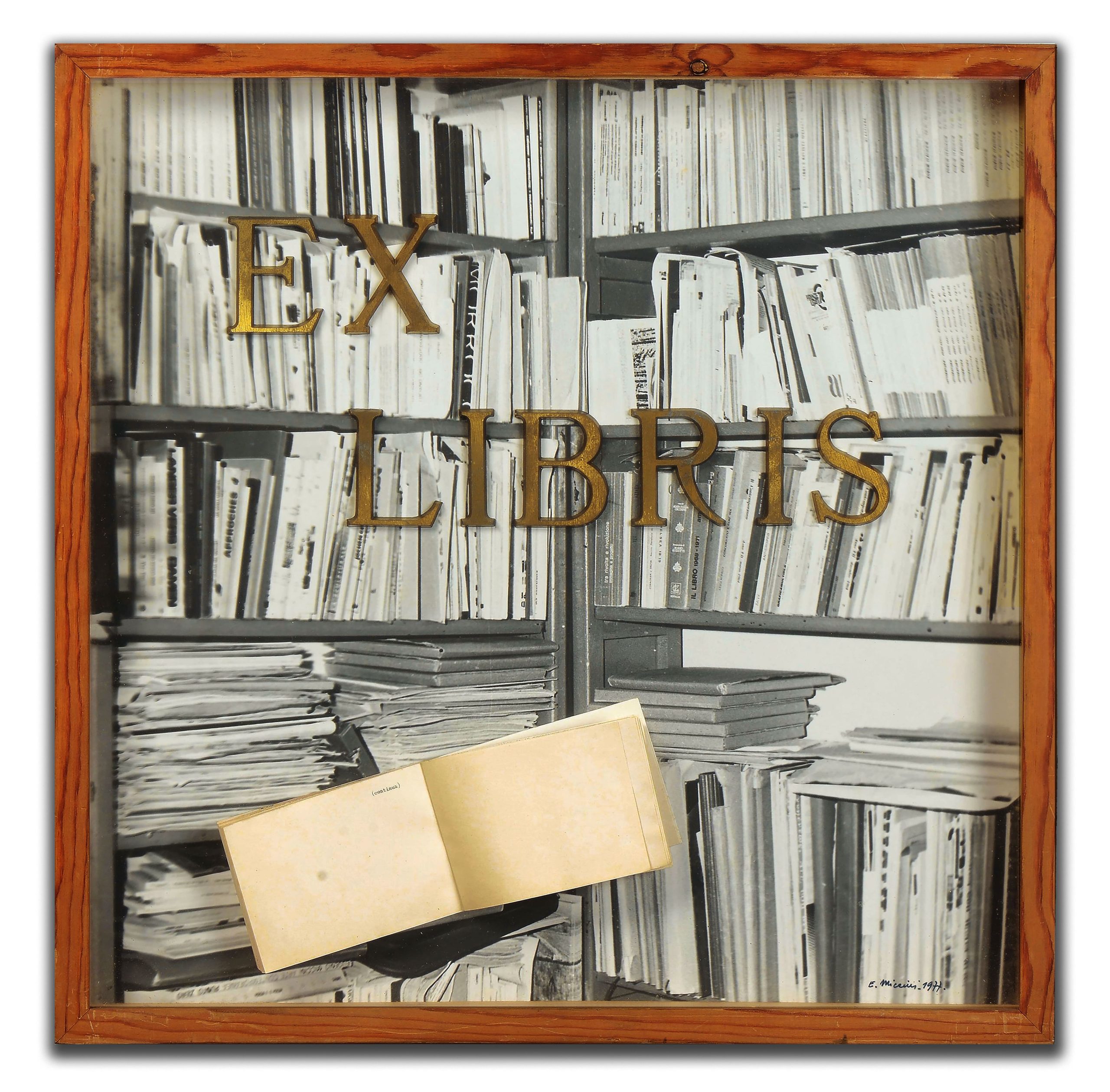 Eugenio Miccini, Ex Libris, 1977 tecnica mista e collage su fotografia in box di legno 52.5×52.55 cm Collezione privata