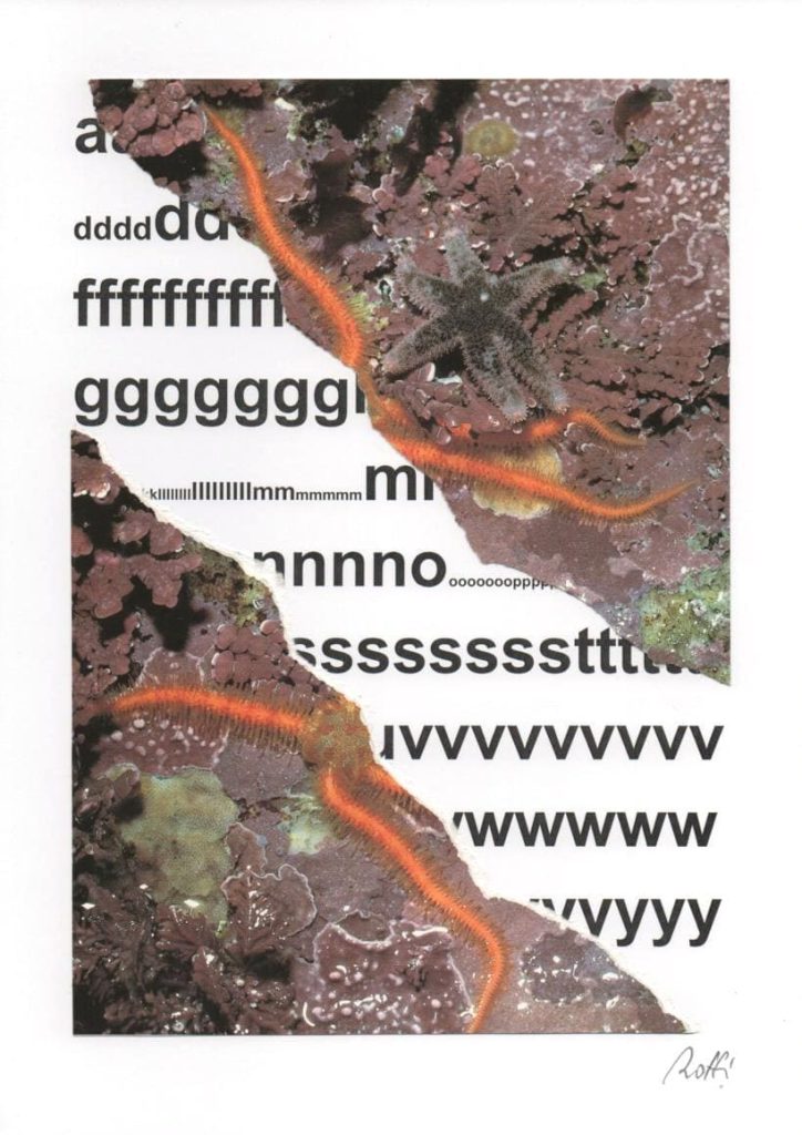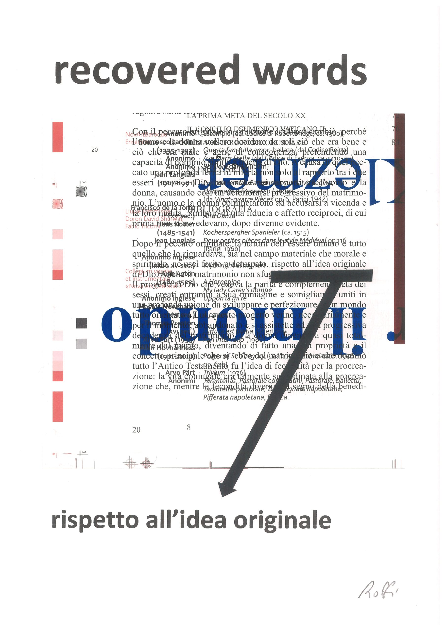 Il primo esempio appartiene ai “Recovered Words”, una serie di collage realizzati a partire dai cosiddetti “fogliacci” tipografici, quelle prove di stampa che servono al registro delle quadricromie, fogli che vengono utilizzati più volte, ottenendo così imprevedibili sovrapposizioni e incroci di testi e di cromie. In questo caos, cerco e individuo alcune parole rilevanti, evidenziandole e portandole all’esterno per salvarle dalla distruzione e offrirle di nuovo all’attenzione dell’osservatore.